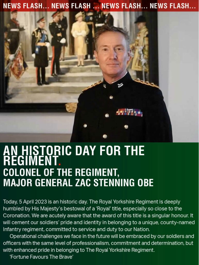 The Colonel of The Regiment, Major General Zac Stenning OBE said: “Today is an historic day. The Royal Yorkshire Regiment is deeply humbled by His Majesty’s bestowal of a ‘Royal’ title, especially so close to the Coronation. We are acutely aware that the award of this title is a singular honour. It will cement our soldiers’ pride and identity in belonging to a unique, county-named Infantry regiment, committed to service and duty to our Nation.