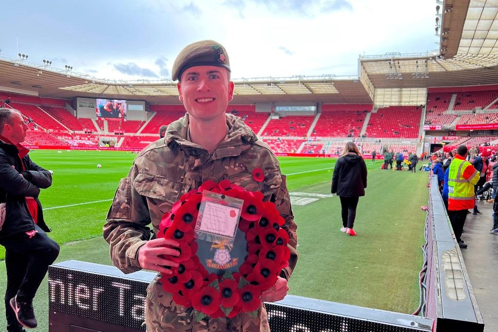 Well done Pte Powell 4 YORKS (Quebec Company) who laid a Regimental wreath at this year’s Middlesbrough FC Remembrance fixture. Pte Powell was joined by 4 YORKS LCpl Mckinlay, Melrose and Haddley – to watch the game.