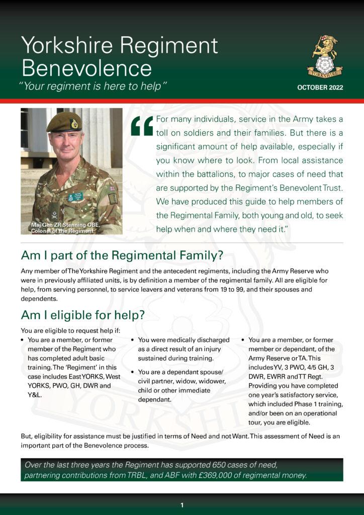 The Royal Yorkshire Regiment Benevolent Trust has provided £300,000 in aid over the last three years to soldiers and their families in need. Issuing around 150 grants annually, the Trust offers vital support during difficult times, such as helping a family with travel and living expenses while their child receives therapy.