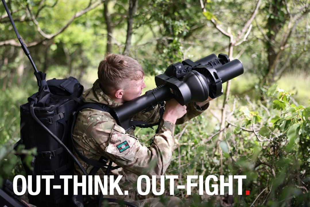 Pte Bloodworth fires the NightFighter anti-drone system at Lulworth Range in the UK. The NightFighter is a family of broadband RF and GPS jammers with a narrow, long-range cone of effect optimised for use against small UAS.